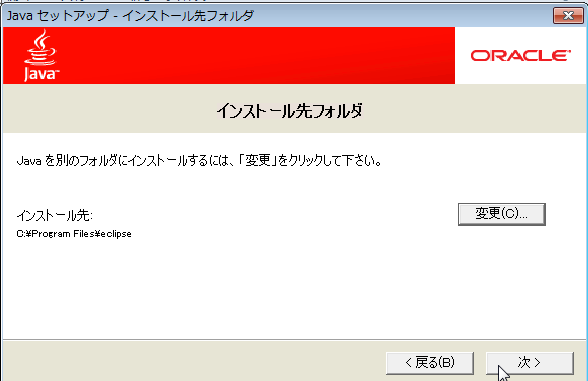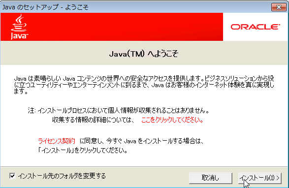 5「Javaへようこそ」というウインドウが表示されています。左下の「インストール先のフォルダを変更する」のチェックボックスを入れます。この作業は忘れないでください。そして、「インストール」ボタンをクリックします。