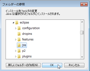 8「新しいフォルダーの作成」ボタンをクリックして、新しいフォルダーを作ります。そのままフォルダー名を指定する状態になるので「jre」と入力します。名前は必ず、この通りにしてください。もちろん、英語文字で入力します。作成した「jre」フォルダを選択してOKボタンをクリックします。