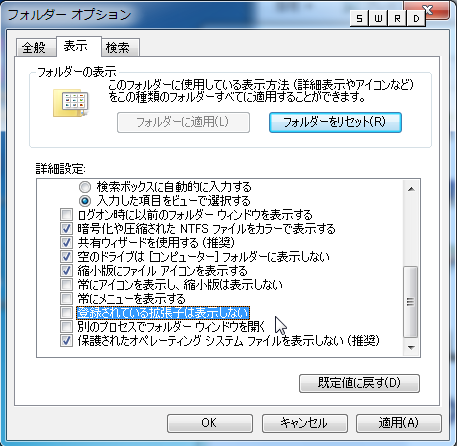 4「フォルダオプション」ダイアログボックスが表示されるので、「表示」のタブをクリックします。そして、「詳細設定」にある「登録されているファイルの拡張子は表示しない」のチェックボックスをオフにします。リストがたくさんありますが、注意深く探せばあるはずです。