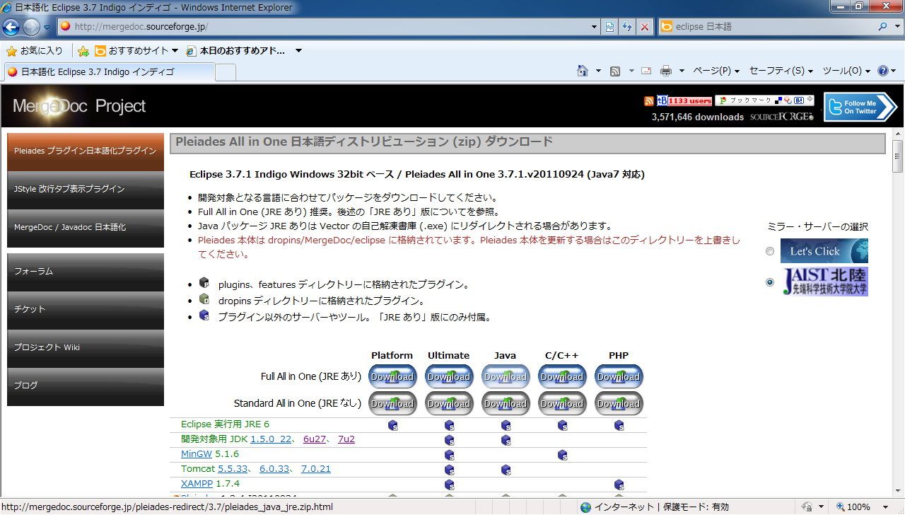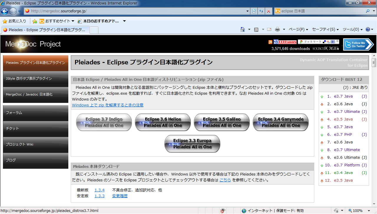 1Webブラウザで「MergeDoc Project」のサイトに行きます。「Eclipse 3.7 Indigo/Pleiades All in One」のボックスをクリックします。