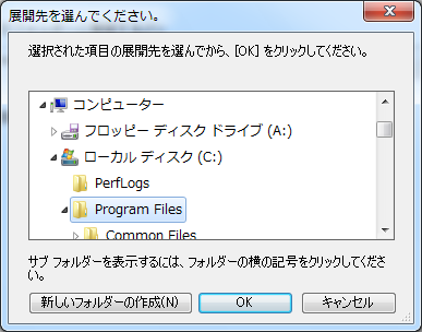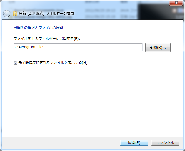 5「圧縮(ZIP形式)フォルダーの展開」というウインドウが表示されます。展開先の「参照」ボタンをクリックして、CドライブのProgram Filesフォルダーを選択します。