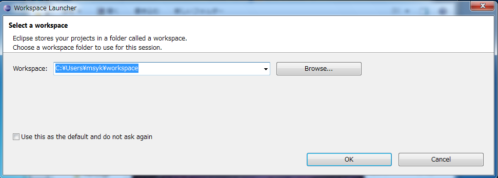 2最初に次のようなワークスペースを確認するダイアログボックスが表示されます。ワークスペースとは、作業用のファイルなどを置いておく場所です。特に理由がなければ、そのままOKを押すことでかまいません。(大学の講義の場合には、ここは講師の指示に従って指定をしてください。)なお、このダイアログボックスはそのままだと起動するたびに出てきます。それが煩わしい場合には起動時に表示しないようにするチェックボックスがありますので、オンにしておきます。