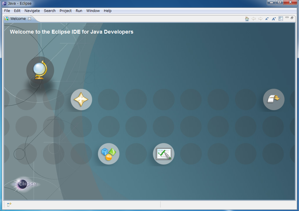 3Eclipseが起動しました。最初は「Welcome to the Eclipse IDE for Java Developers」という画面が出ています。ここでは、右上の曲がった矢印のアイコンをクリックしてください。
