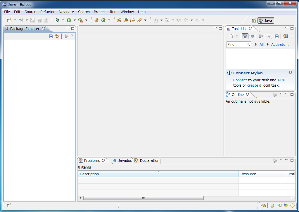 4Eclipseの作業画面になりました。メニューバーやツールバーが上部にあり、ウインドウの中はいくつかの領域に分割されています。この中身はカスタマイズできますが、この状態で使うことを基本として以後説明します。ウインドウの大きさなどは、使用しているコンピュータに応じて適当に大きくしたり小さくしたりして使ってください。