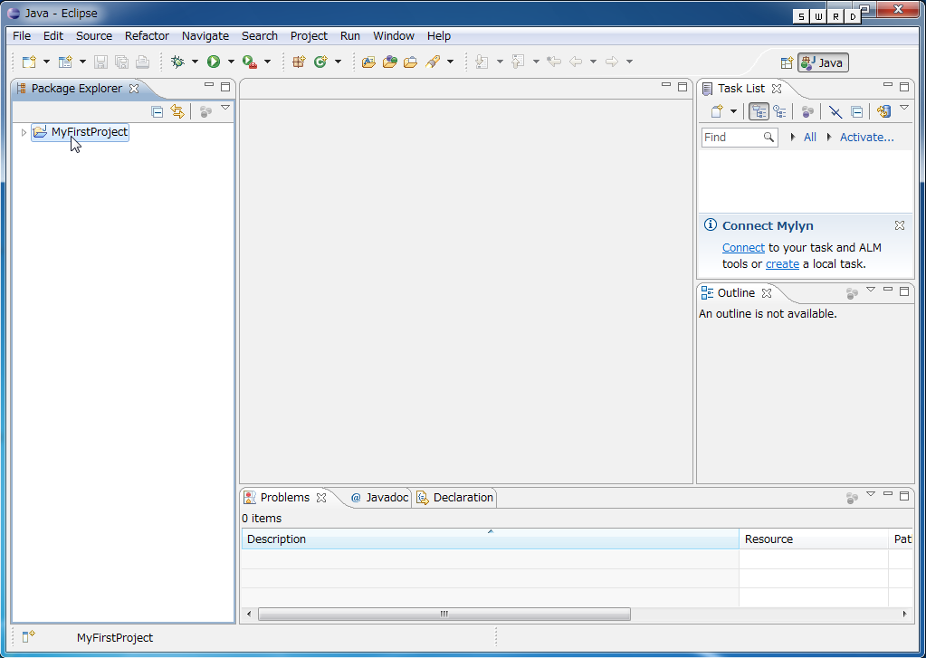 3プロジェクト「MyFirstProject」が作成されて、パッケージ・エクスプローラに項目が見えました。この段階では、プロジェクトつまりファイルなどの置き場所がまず確保されただけであることを示しています。