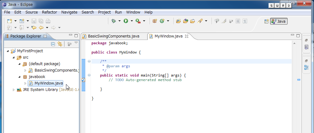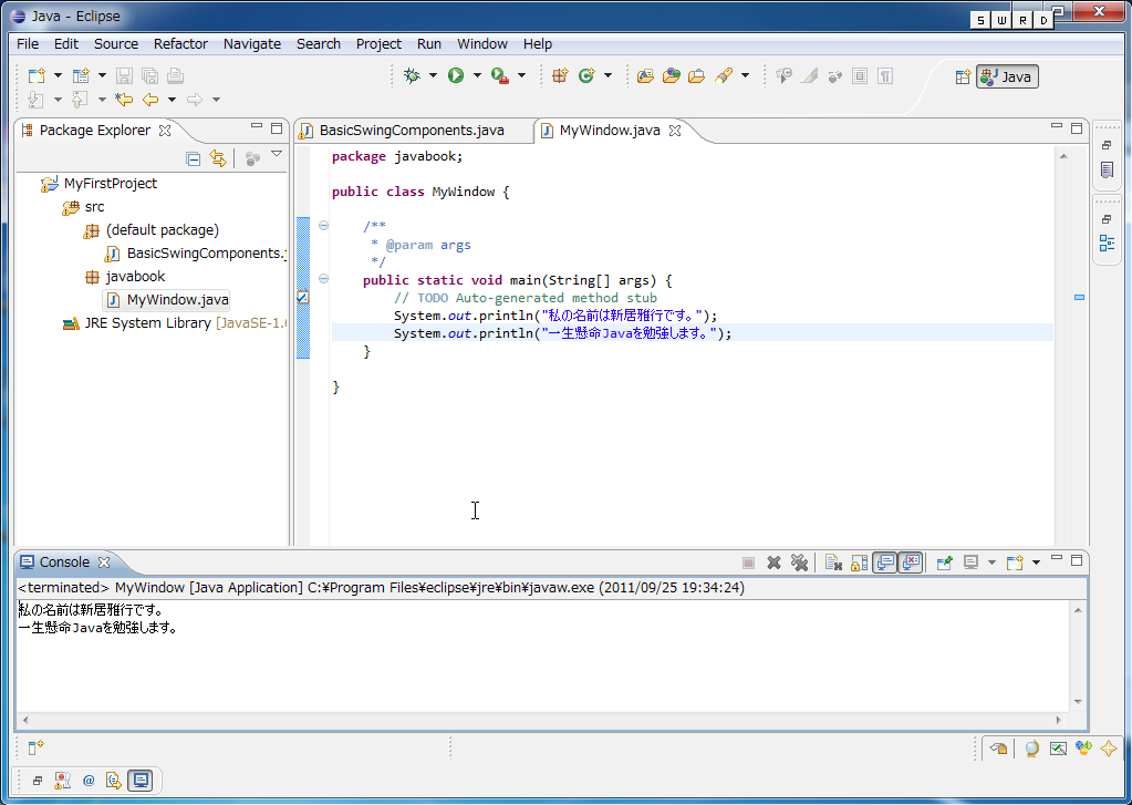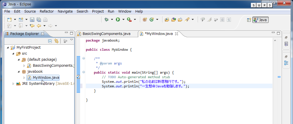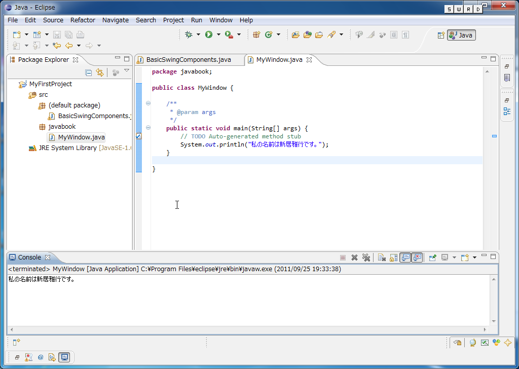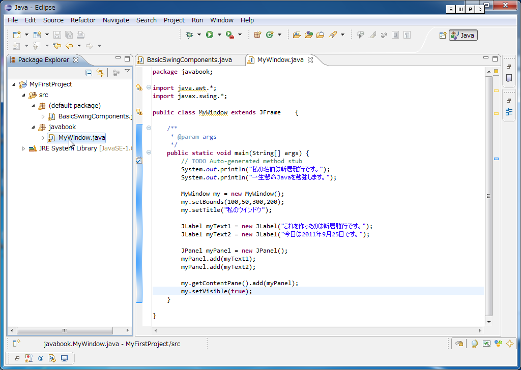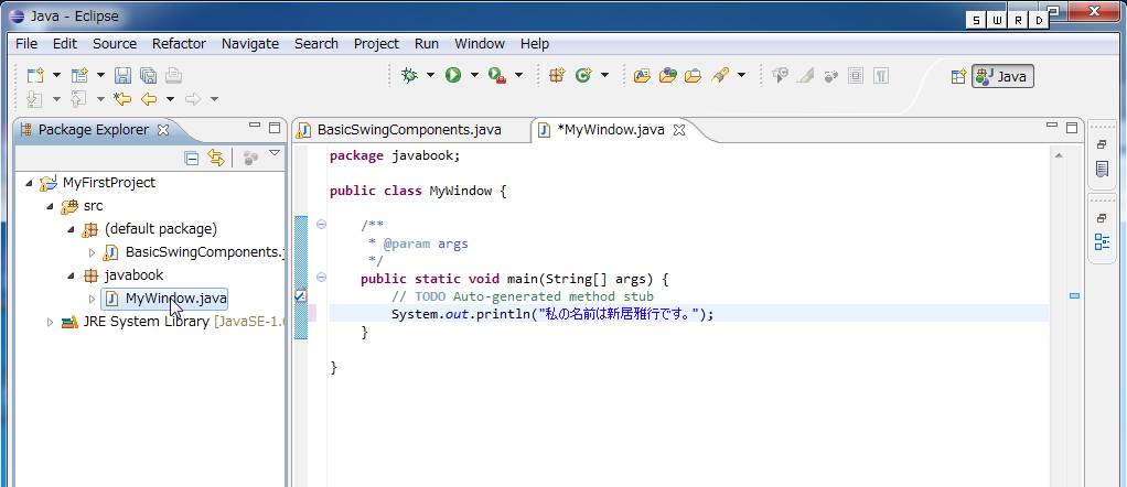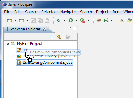 7左側のパッケージ・エクスプローラに、「BasicSwingComponents.java」の項目が増えました。下位の項目が見えていない場合は、「MyFirstProject」の項目の左側の三角ボタンをクリックします。「BasicSwingComponents.java」を「src」の下にドラッグ&ドロップして、「src」の下に「BasicSwingComponents.java」があるようにします。
