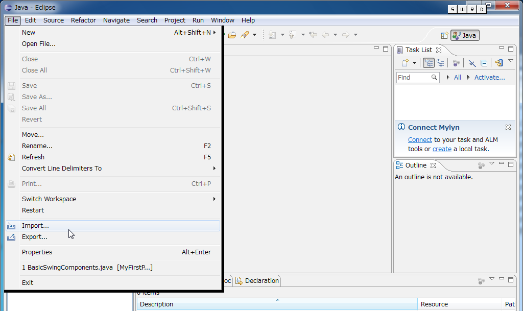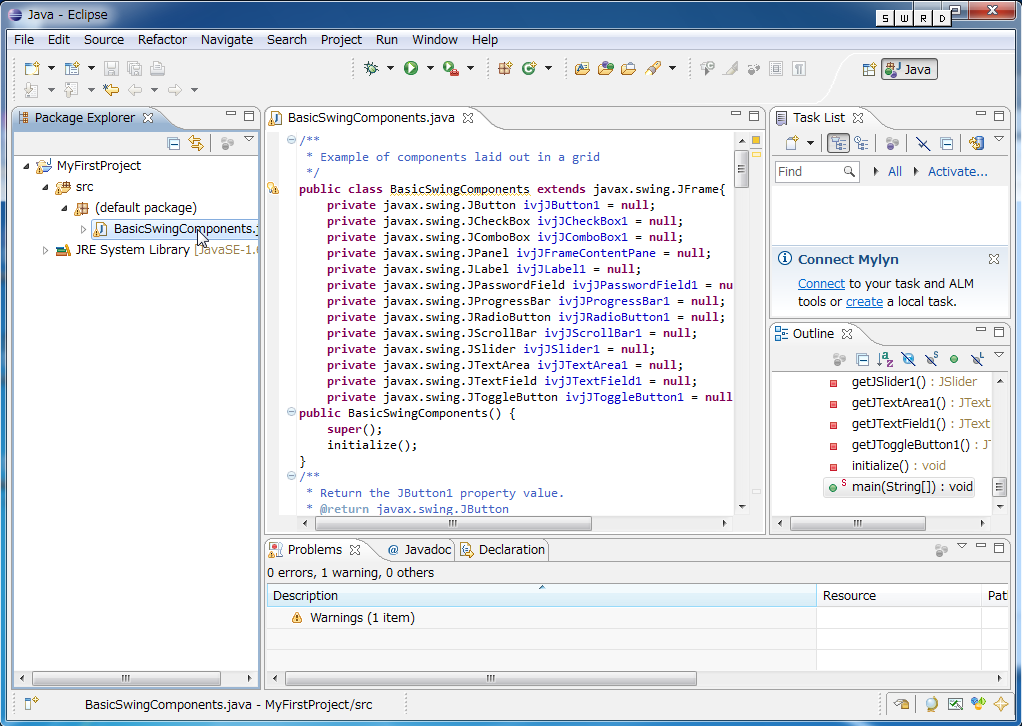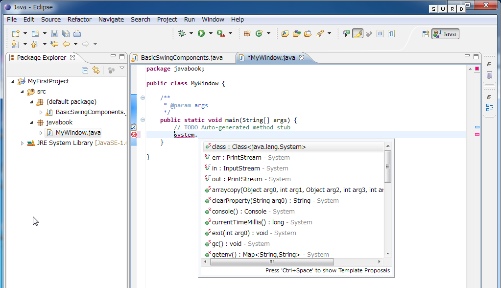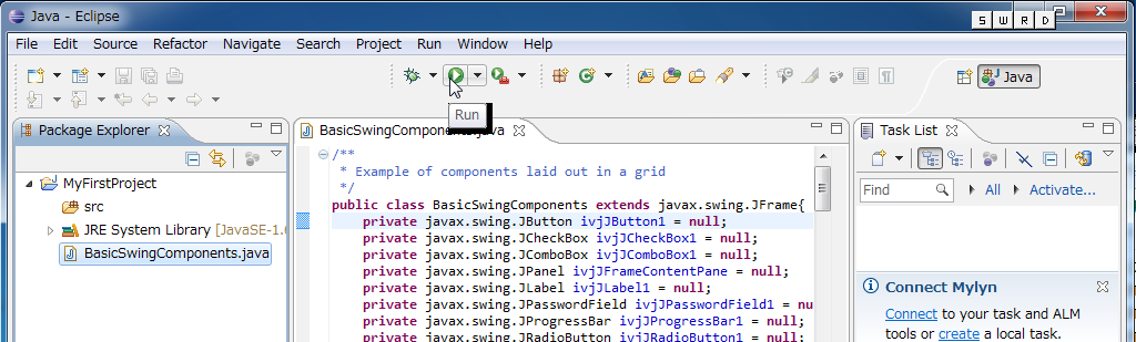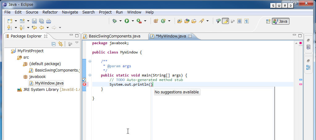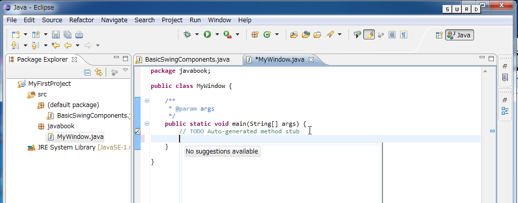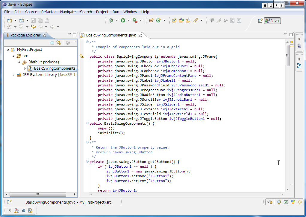 7左側のパッケージ・エクスプローラに、「BasicSwingComponents.java」の項目が増えました。下位の項目が見えていない場合は、「MyFirstProject」の項目の左側の三角ボタンをクリックします。「BasicSwingComponents.java」を「src」の下にドラッグ&ドロップして、「src」の下に「BasicSwingComponents.java」があるようにします。
