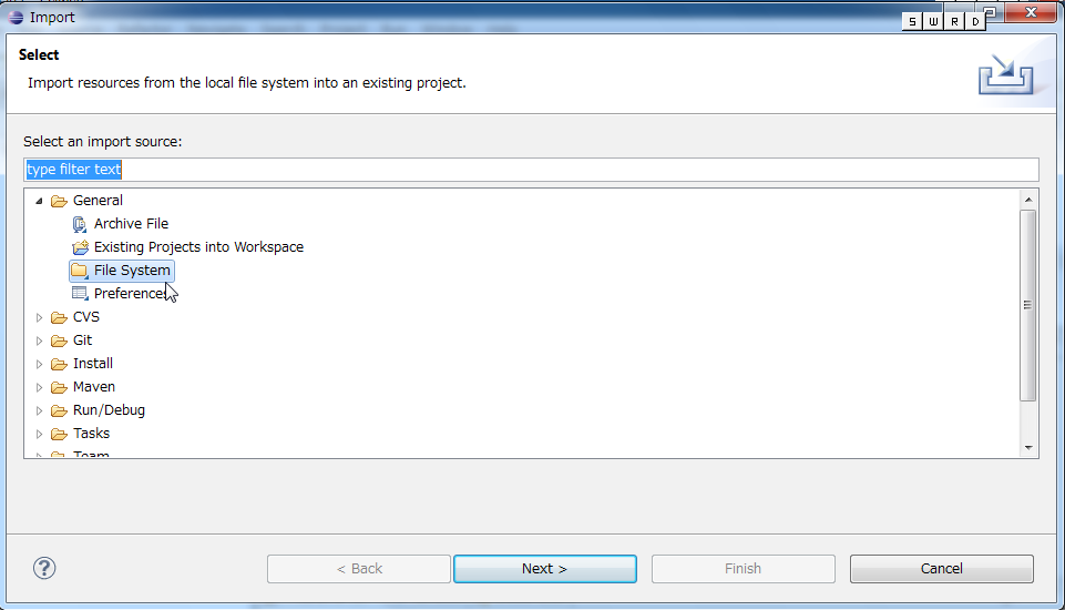 3最初のダイアログボックスでは、一覧にある「General」のさらに下位項目にある「File System」を選択して、「Next」ボタンをクリックします。