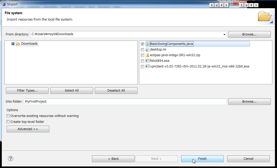 62列のリストの右側にフォルダの一覧が表示されます。ここで、「BasicSwingComponents.java」の左のチェックボックスにチェックを入れておきます。そして、「Finish」ボタンをクリックします。