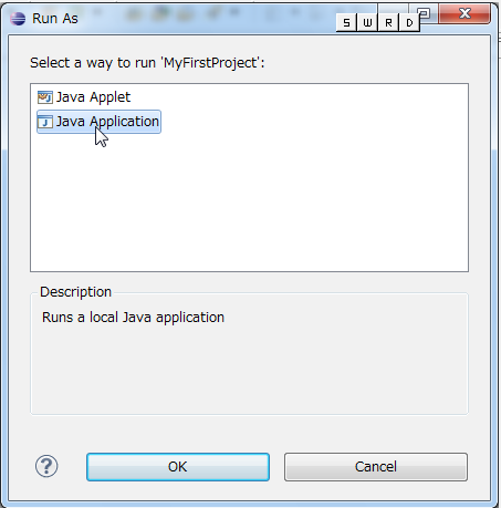 2実行するプログラムのタイプを選択するダイアログボックスが表示されます。このプログラムは「Java Application」を選択します。選択後、OKボタンをクリックします。