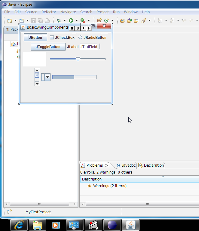 3少し待つと、小さなウインドウが表示されます。真っ白な部分が多いウインドウが見えています。独立したウインドウの中で、ボタンをクリックしたり、スライダーを動かしたりすることができることを確認してください。そして、Windowsのタスクバーをみると、「BasicSwingComponents」と書かれたボタンが増えていて、1つのアプリケーションとして稼働していることがわかります。