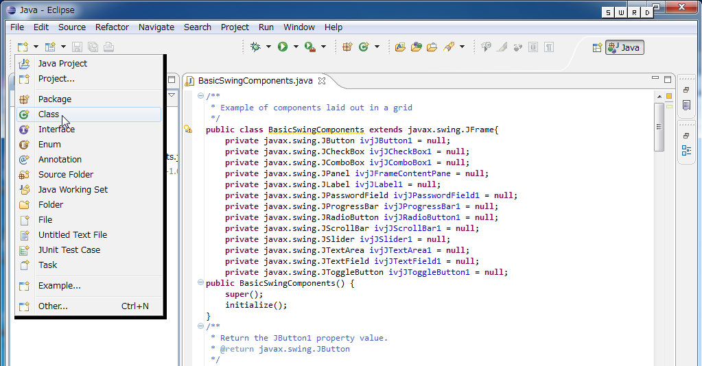 8「src」の下位項目にある「BasicSwingComponents.java」をダブルクリックすると、中央のエリアにプログラムが見えています。これがこのファイルに含まれているプログラムです。