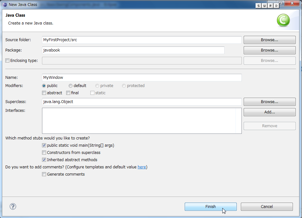 2新たにクラスを作成するための設定を行います。「Source folder/ソース・フォルダー」には、プロジェクト名が自動的に入っています。「Package/パッケージ」は今回のプログラムではあまり意味はありませんが設定を促されるので「javabook」と入力しておきましょう(本来は正しい命名のルールなどがありますが、練習用のプログラムでは任意に設定していいでしょう)。そして、「Name/名前」に「MyWindow」とキータイプします。そして下の方の「public static void main(String[] args)」のチェックを入れておきます。他はそのままにして、「終了」ボタンをクリックします。