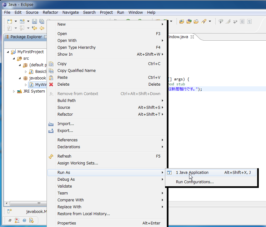 8ナビゲーションに見えている「MyWindow.java」の項目を右ボタンでクリックして、メニューを表示します。「Run As/実行」から「1 Java アプリケーション」を選択します。