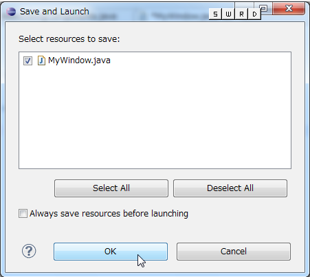 9次のようなダイアログボックスが出ます。「Always save resources before launching/常に起動前にリソースを保存する」のチェックボックスをオンにして、OKボタンをクリックします。プログラムのテキストを変更した後には必ず保存をする必要があるのですが、このチェックにより、自動的に保存をしてくれるようになります。