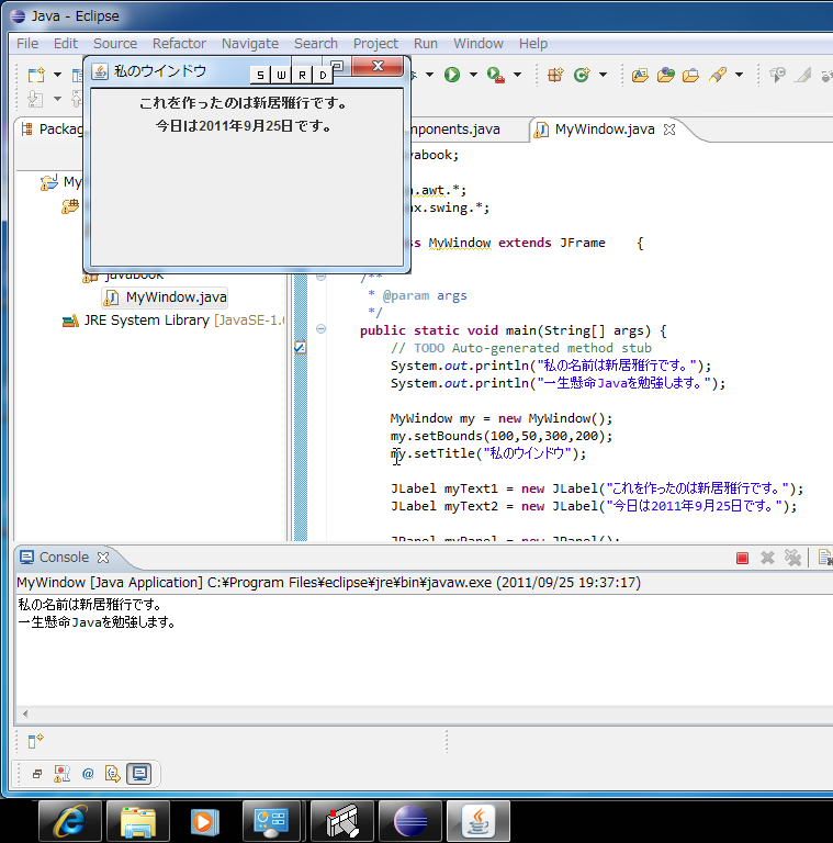 3-1: 自分で作ったプロジェクト「MyWindow.java」のプログラムにおいて、自分の名前と日付ではなく、自分の所属する大学名と、自分の所属する学科学部名を表示するように、プログラムを修正してみてください。