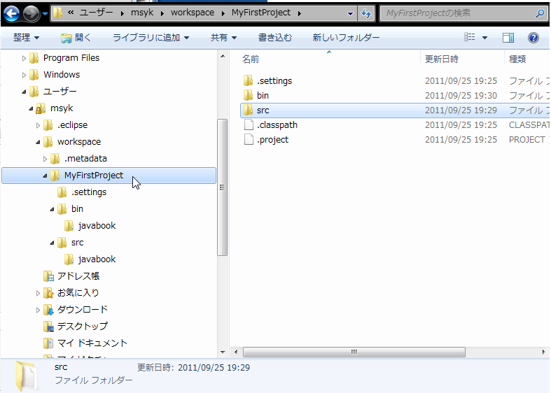 プロジェクトフォルダの中を見てみましょう。.classpathや.projectというフォルダと、javabookというフォルダがあります。ドットで始まるファイルは、たとえばプロジェクトの中身にどんなファイルがあるのかなどのさまざまな情報が込められているようです。