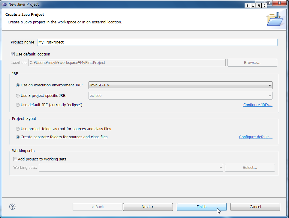2プロジェクトの名前などを決めます。ここでは「Project name/プロジェクト名」として「MyFirstProject」と入力をしてください。他の選択肢は、そのままの設定で「Finish/終了」をクリックします。