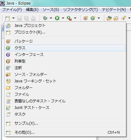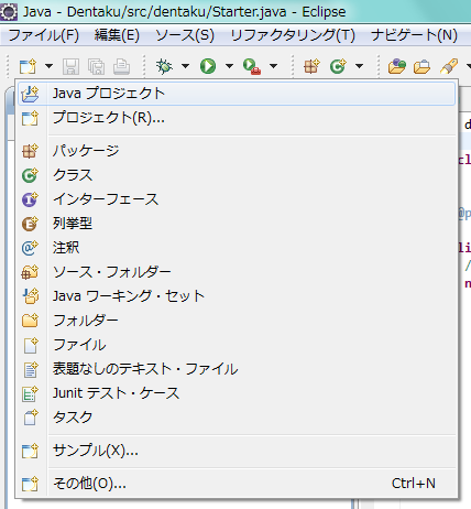 1ツールバーのいちばん左にある「新規」ボタンの右にある▼をクリックしてメニューを表示します。ここから「Javaプロジェクト」を選択します。