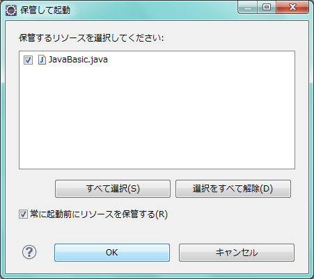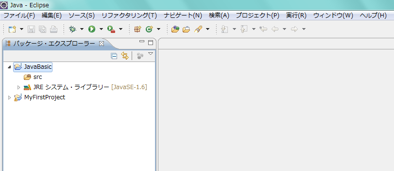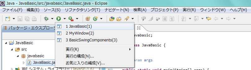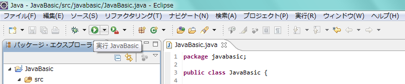 以上の作業で、プロジェクトにアプリケーションが加わり、実行するとアプリケーションが起動するようになります。アプリケーション本体のソースプログラムがJavaBasic.javaです。