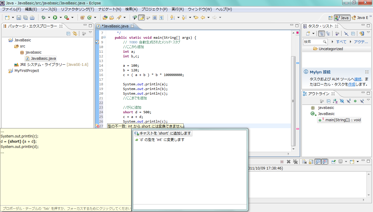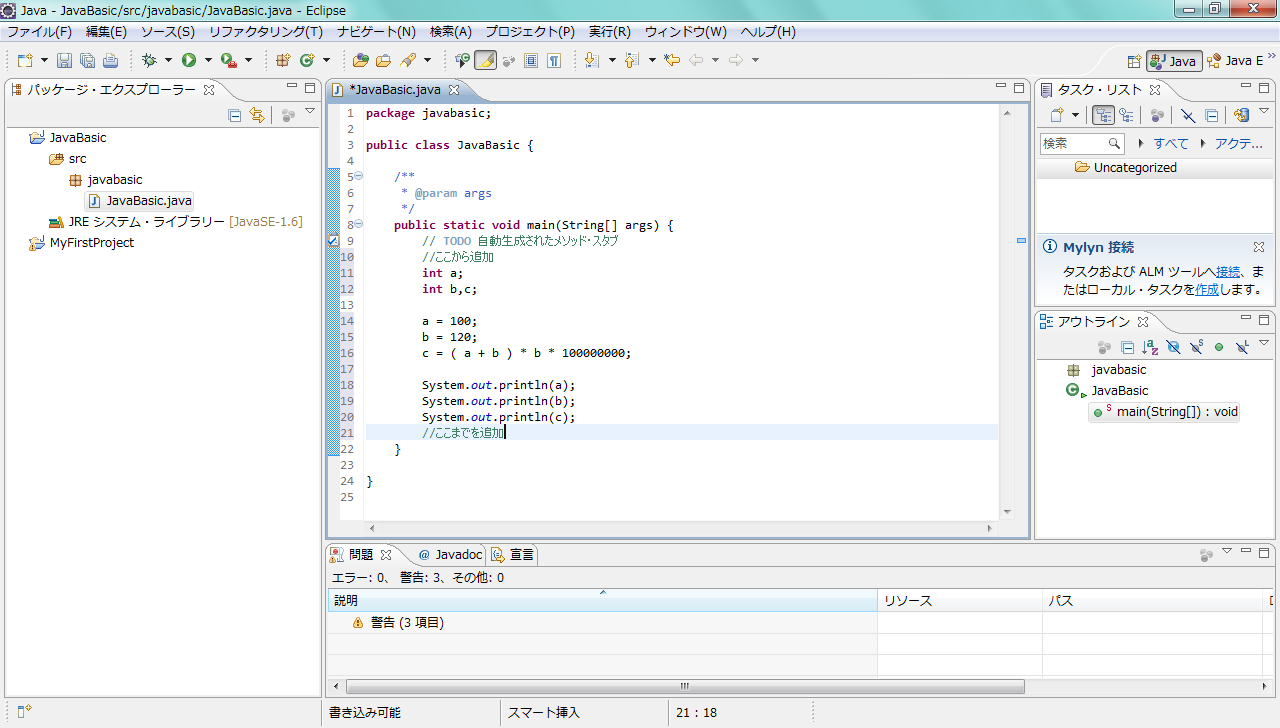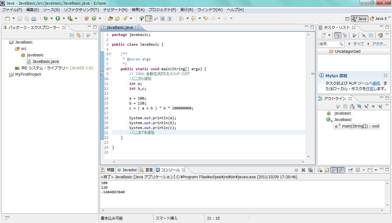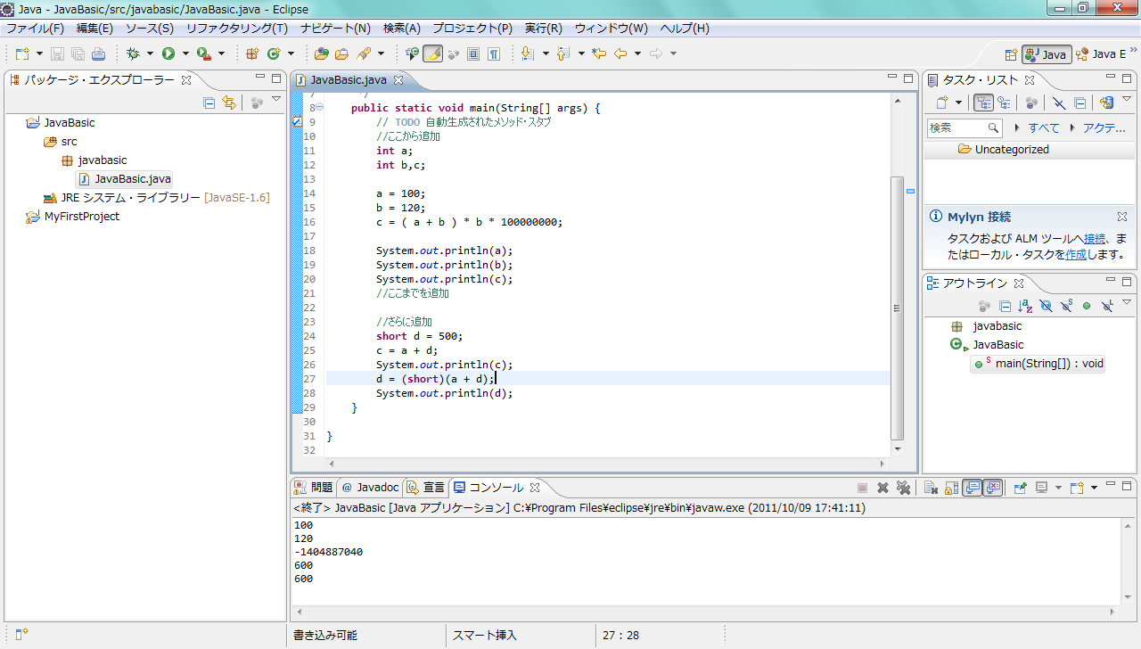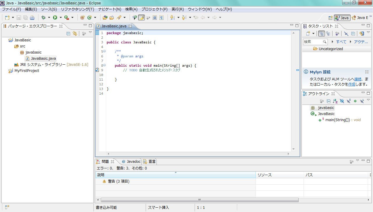 それでは、アプリケーションウィザードが用意したアプリケーションのソースJavaBasic.javaにプログラムを追加して、この章の核心に入って行くことにしましょう。