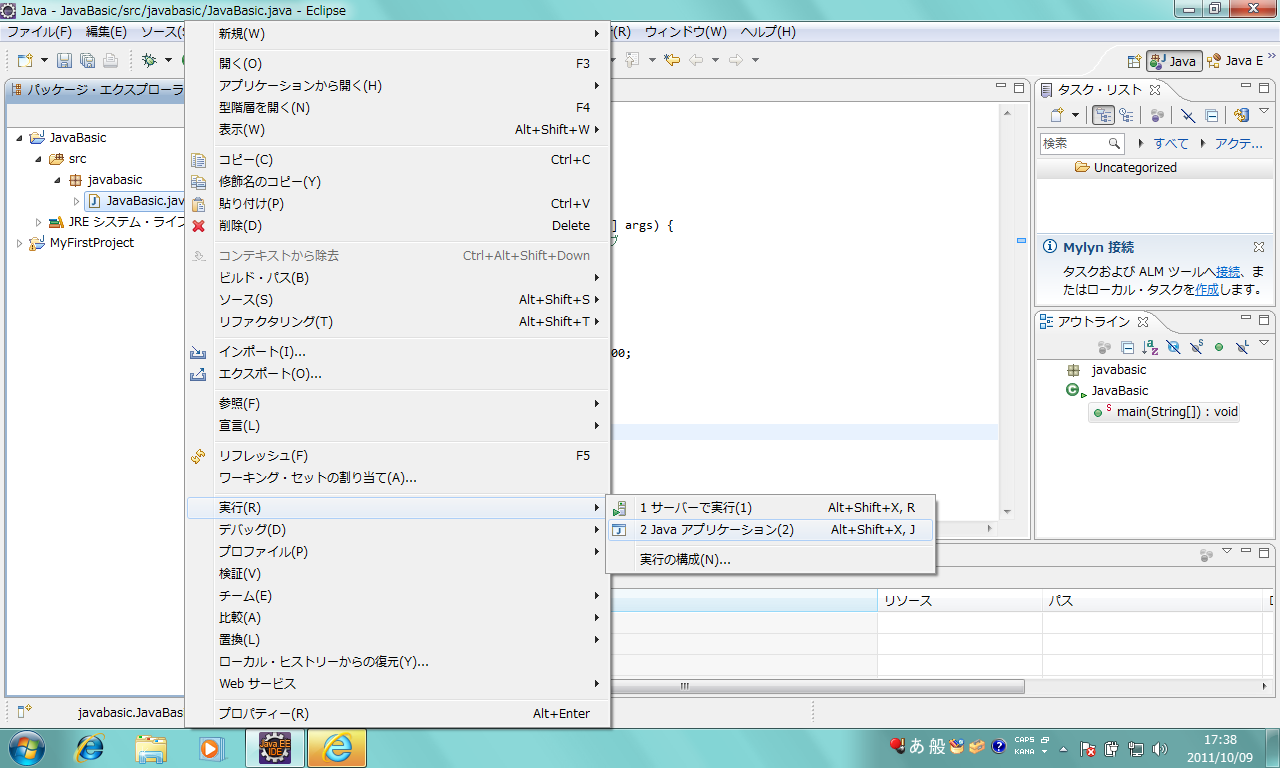 前述のプログラムを追加したら、実際にプログラムを実行させてみます。実行する場合、ツールバーのボタンを使うのが典型的な方法ですが、始めてプログラムを実行するときには、プログラムファイル、つまりこの場合はウインドウ左側のリストにある「JavaBasic.java」という項目を右ボタンでクリックして、「実行」から「Javaアプリケーション」を選択してください。これにより、このプログラムが実行対象として記憶されますが、最初の1回の実行だけは、このように右クリックしてメニュー選択をするのが手軽でしょう。