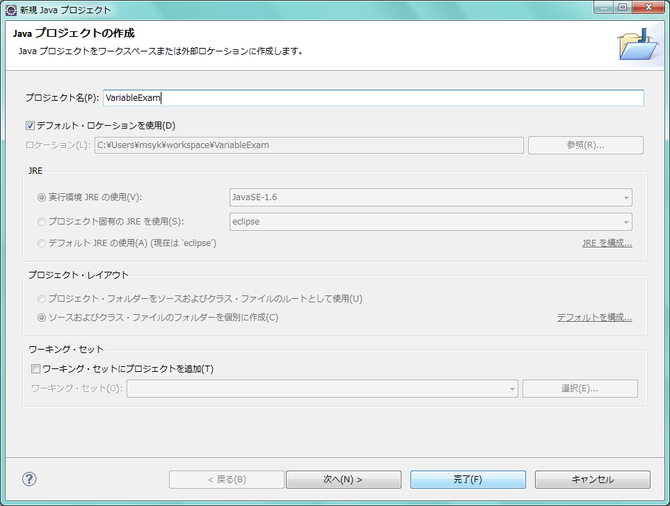 VariableExam.javaのプログラムの、public static void mainの最後のところに、以下のようなプログラムを入力します。プログラムを入力する場所は、前のプログラムの続きのところにします。