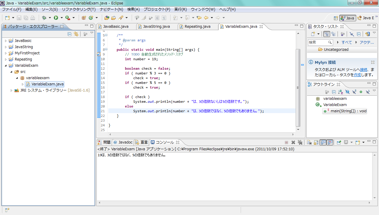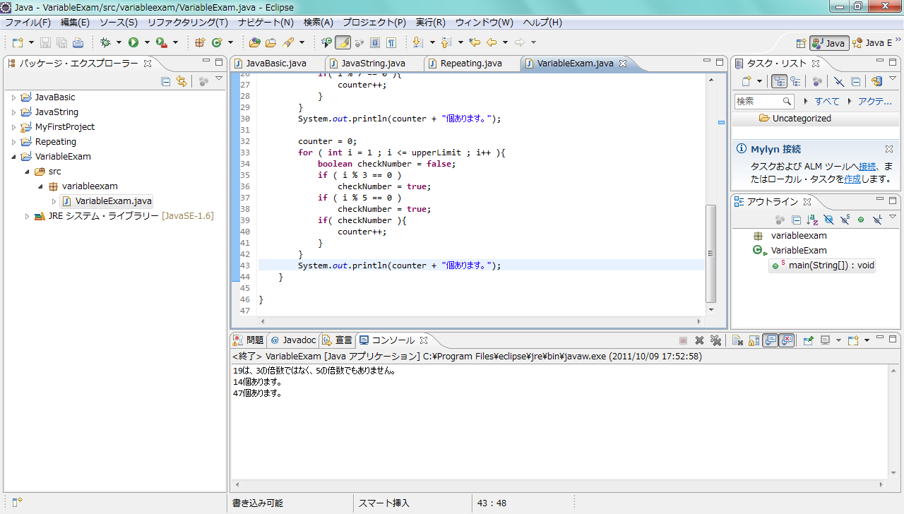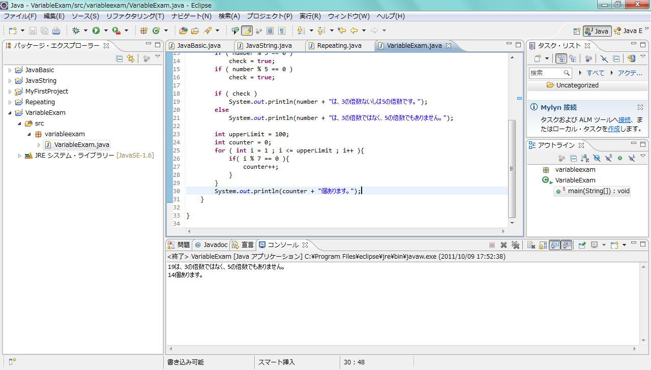 ここまでで、「3ないしは5の倍数」かどうかを判断するプログラムと、条件に合ったものを数えるプログラムを紹介しました。それでは、ここで2つのプログラムをうまく合体させて「3ないしは5の倍数の数を数える」というプログラムを作ってみます。VariableExam.javaのプログラムの、public static void mainの最後のところに、以下のようなプログラムを入力します。プログラムを入力する場所は、前のプログラムの続きのところにします。