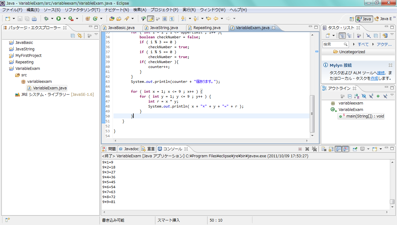 実行結果は1つの計算に1行を使っているので、みづらいものになっていますが、System.out.printlnのステートメントが、81回繰り返されていることに注目してください。つまり、9回の繰り返しを9回行うので、9×9=81回です。