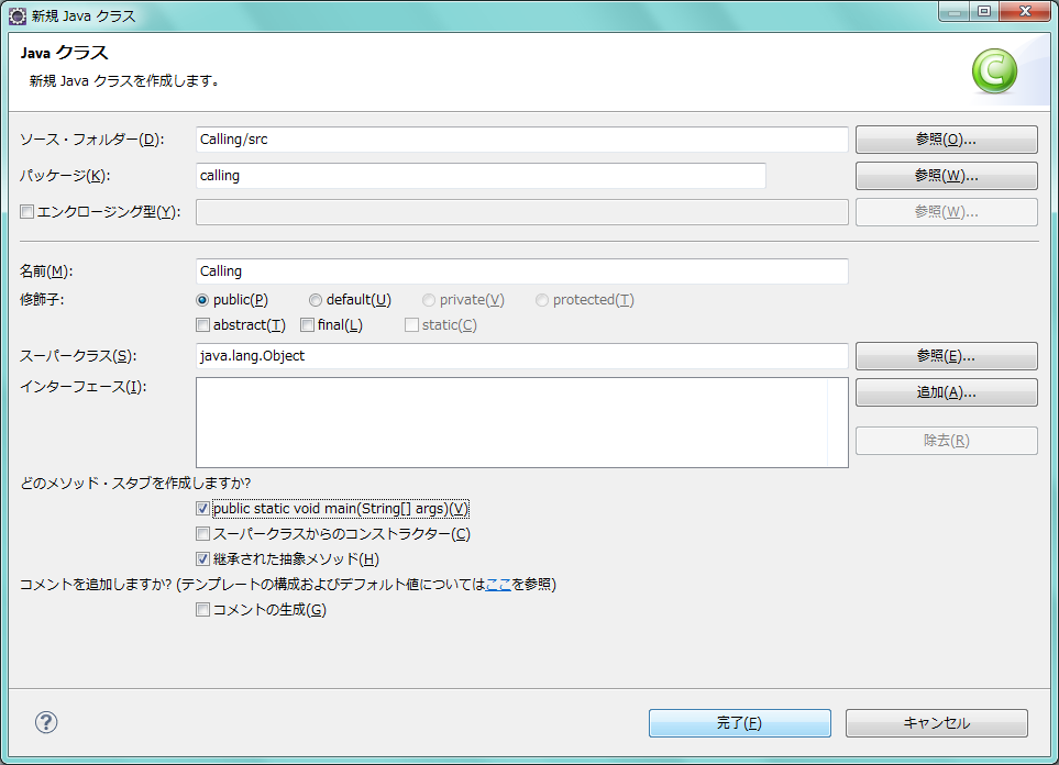 この章で入力するプログラムとアプリケーションのひな形を作っておきましょう。手順については、これまでの章とまったく同じですので、ここでは手順は示しません。ウィザードの画面のうち、ポイントになる部分だけを示しておきます。クラスの名前を設定する時、パッケージの名前と「public static void main(String[] args)」のチェックを入れておく事を忘れないようにしましょう。