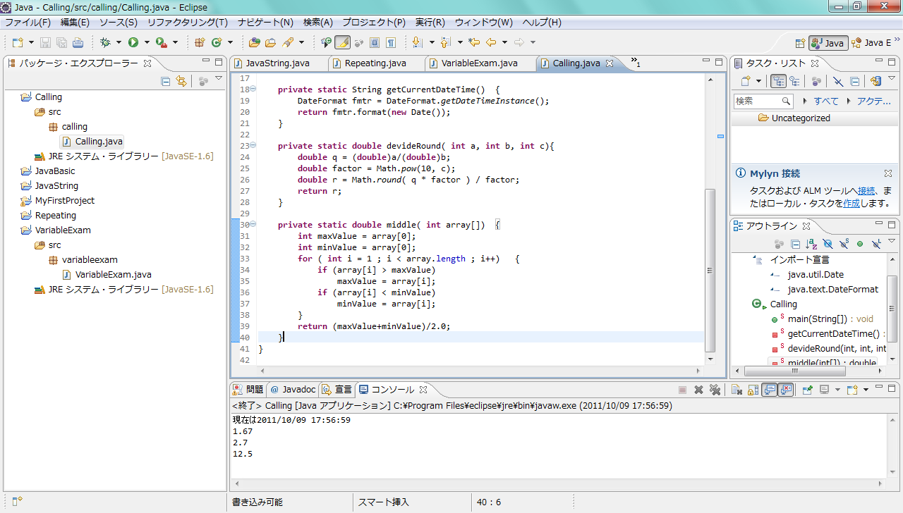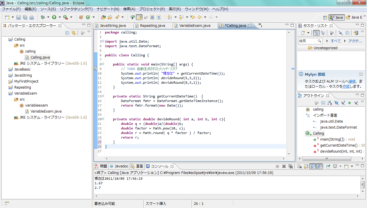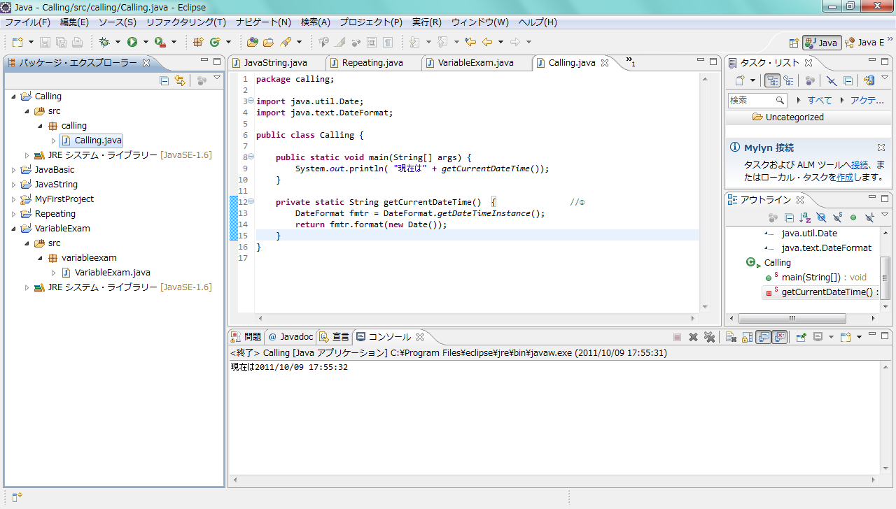 実際のプログラムでメソッドを定義し、それを使うということを行ってみましょう。作成したクラスCallingについて、次のように必要な部分を書き加えて下さい。プログラムを実行すれば分かりますが、現在の日時が表示されています。日時の扱いについてはいろいろな規則が絡んできますが、ここでは「ともかくこのように書けば現在の日時が文字列で得られる」という方法として、詳細は理解しなくてもかまいません。