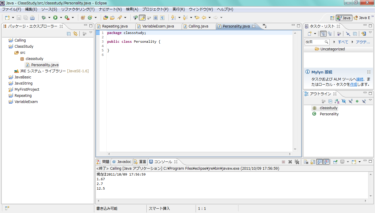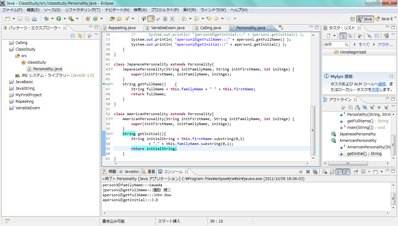 Personalityクラスは、前の実行例のときのまま変更はありません。同じPersonality.javaというファイルの中に、新たにAmericanPersonalityとJapanesePersonalityの2つのクラスを定義しました。なお、ここでは手順を単純にするため、同じファイルに3つのクラスを定義しましたが、通常、Javaの世界では、クラスごとにファイルを別々にするのが作法となっています。