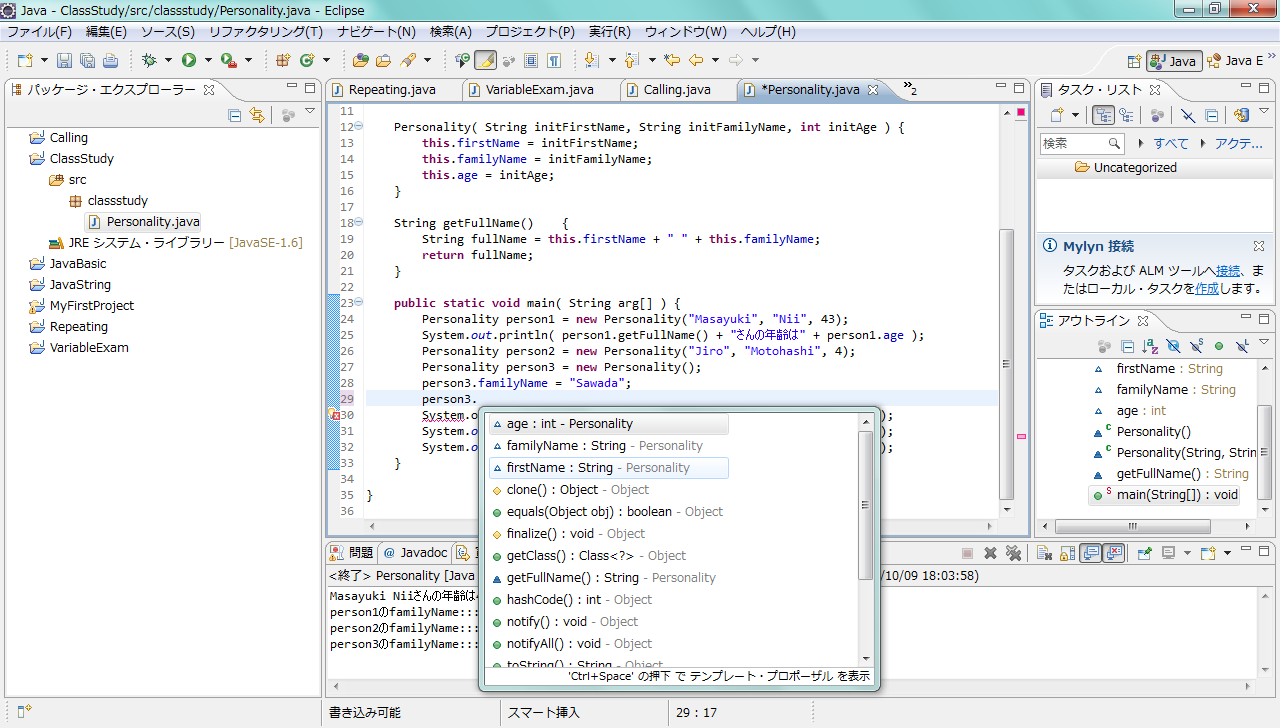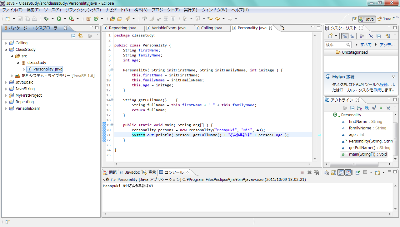 System.out.println( person1.getFullName() + "さんの年齢は" + person1.age );