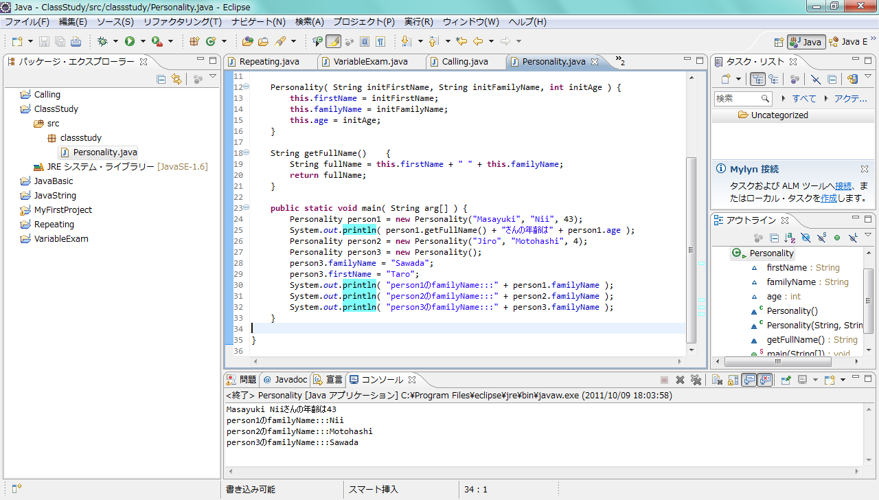 ここまでに作ったPersonality.javaのプログラムを以下のように修正して、Personalityクラスのインスタンスを3つ作ってみます。そして、それぞれのインスタンスから、同じfamilyNameのインスタンス変数を標準出力に出力します。同じインスタンス変数ではありますが、参照するインスタンスが違っていると変数の値が違っていることを確認しましょう。なお、ここでは、引数のないコンストラクタと、引数のあるコンストラクタの両方を使いますので、引数のないコンストラクタ「Personality( )」も明示的にプログラムの中で作る必要があります。プログラムとして記述する内容がなくても、「Personality( )」は必要になります。