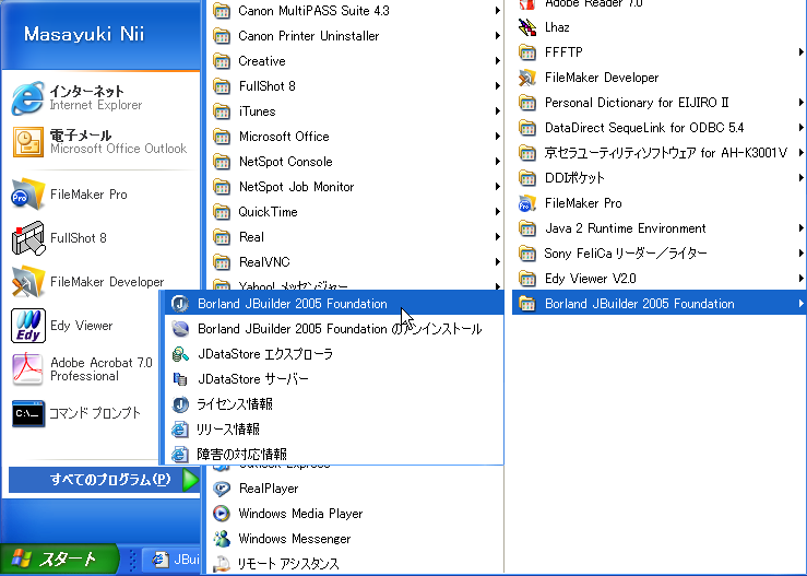 1スタートメニューの「すべてのプログラム」に「Borland JBuilder 2005 Foundation」という項目があります。そこにある「Borland JBuilder 2005 Foundation」を選択します。(応用情報処理Vの講義では、JBuilder 7 Personalを起動して下さい。)