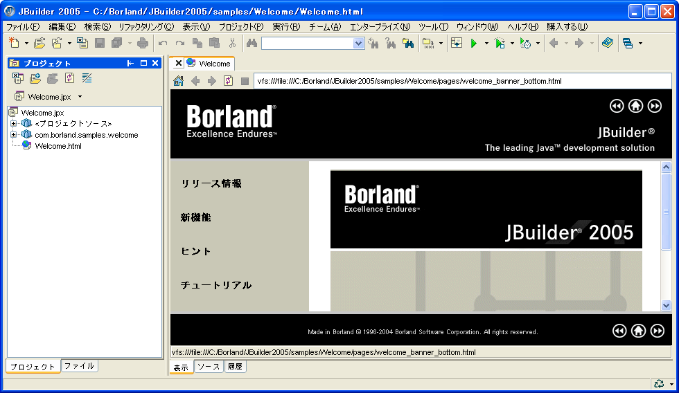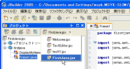 別の機会にJBuilderを起動した場合、通常は終了時に開いていたプロジェクトが再度開かれますので、そのままプログラム作業の続きに取りかかれます。今後、たくさんのプロジェクトを切り替えて使うという状況になった場合には、ツールバーの2段目にあるプロジェクトファイル名の見えている部分がドロップダウンリストになりますので、過去に開いたことがあるプロジェクトはここにリストとして項目が出てきます。