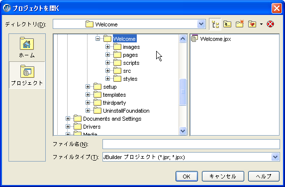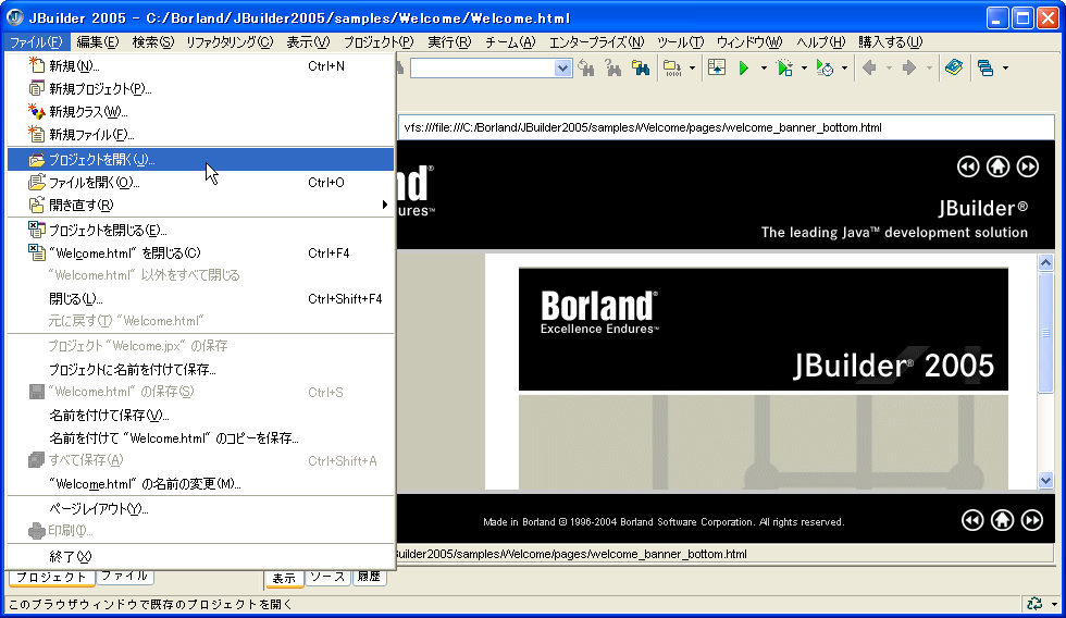 3「ファイル」メニューから「プロジェクトを開く」を選択します。“プロジェクト”とは、あるソフトウエアを作るのに必要なさまざまな素材全体を指す言葉ですが、それらの素材はたくさんのファイルとしてフォルダにまとめられて管理されています。その素材全体を管理するファイルとして“プロジェクトファイル”があり、そのプロジェクトファイルを開くことで、プログラム作成作業に必要なものが呼び出されて、JBuilderは作業可能な状態にセットアップされます。