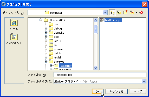 5最初はWelcomeという項目が選択されていますが、その1つ前にTextEditorという項目があります。左側のリストをスクロールしてその項目を選択します。すると、右側にTextEditor.jpxという項目が表示され選択されています。この状態を確認してOKボタンをクリックします。TextEditor.jpxがプロジェクトファイルであり、.jpxがプロジェクトファイルの拡張子です。(応用情報処理Vの講義では、マイドキュメントにコピーしたSwingフォルダの内容を開きます。)