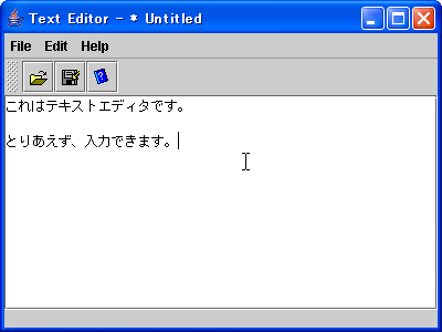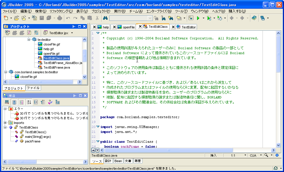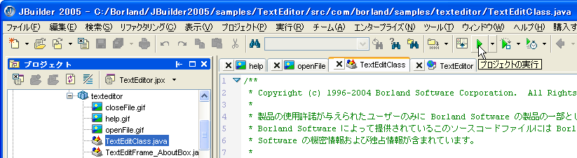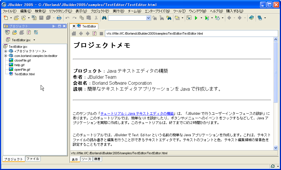 JBuilderにはサンプルプログラムがあり、それを使えばとりあえずは、JBuilderの一通りの作業を経験できるでしょう。テキストエディタというシンプルなものですが、実際に使ってみます。