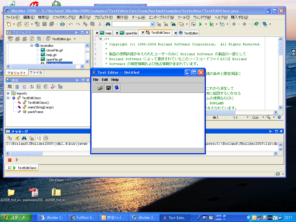 2 「ビルド状況」というダイアログボックスが出た後、少し待つと、小さなウインドウが表示されます。真っ白な部分が多いウインドウが見えていますが、メニューバーやツールバーも見えています。JBuilderのウインドウには「メッセージペイン」が見えていますが、実行したときにはこのペインが表示されて、状況を報告するということもできるようになっています。また、Windowsのタスクバーをみると、「Text Editor」と書かれたボタンが増えていて、Text Editorが1つのアプリケーションとして稼働していることがわかります。