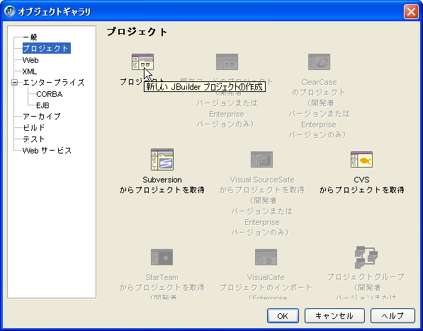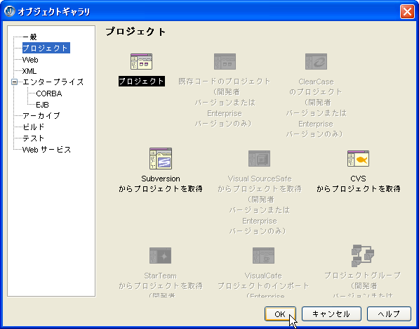 2 「オブジェクトギャラリ」というダイアログボックスが表示されます。左側のリストで「プロジェクト」を選択します。