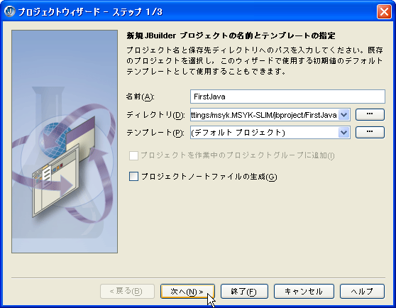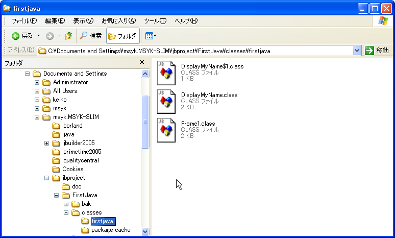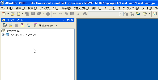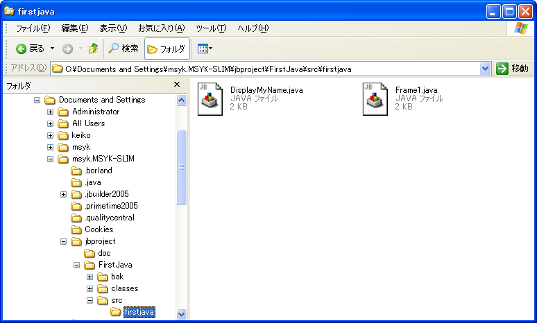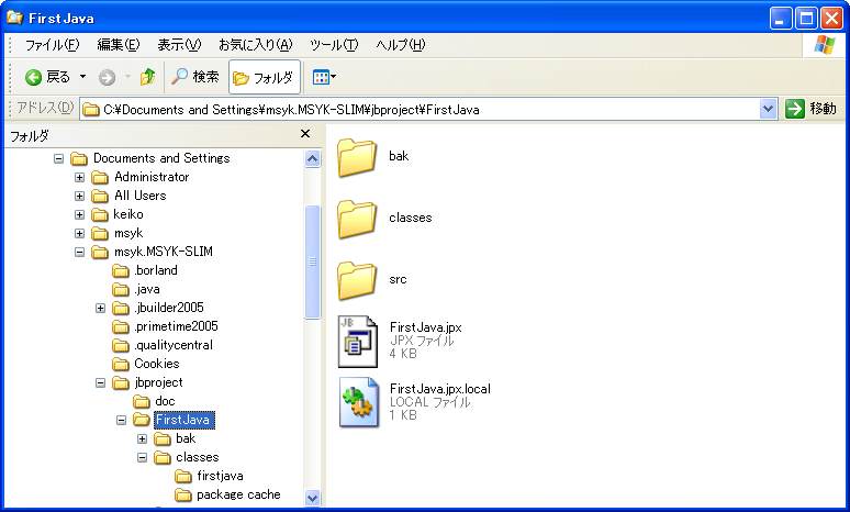 こうしてプロジェクトのファイルが作成されますが、上記の手順だと、そのフォルダは手順4で記述されているディレクトリに作成されます。以上のような流れでは、起動ディスク(ここではC)のホームフォルダ(ここでは、「C:¥Documents and Settings¥msyk」でmsykはログインユーザ名)にjbprojectというフォルダが作られ、そこにFirstJavaフォルダが作られています。ファイルのありかは確認しておくと良いでしょう。