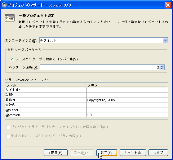 4ウィザードの3番目のダイアログボックスが表示されます。ここでも設定は変更する必要はありません。「終了」ボタンをクリックします。