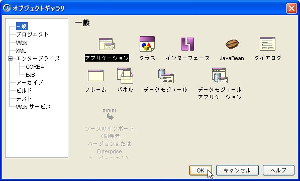 1ツールバーの「新規」ボタンをクリックします。 「オブジェクトギャラリ」が開くので、左側で「一般」が選択されているのを確認し、右側のアイコンの中にある「アプリケーション」をダブルクリックするか、クリックして選択してOKボタンをクリックします。