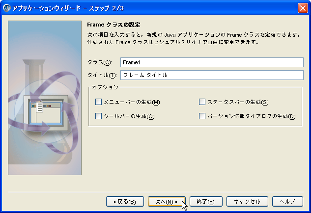 3ウィザードの2番目のダイアログボックスが出てきます。ここでの「クラス」が後で重要な名前になります。とりあえず既定値の「Frame1」のままにし、ここでは何もせずに「次へ」をクリックします。