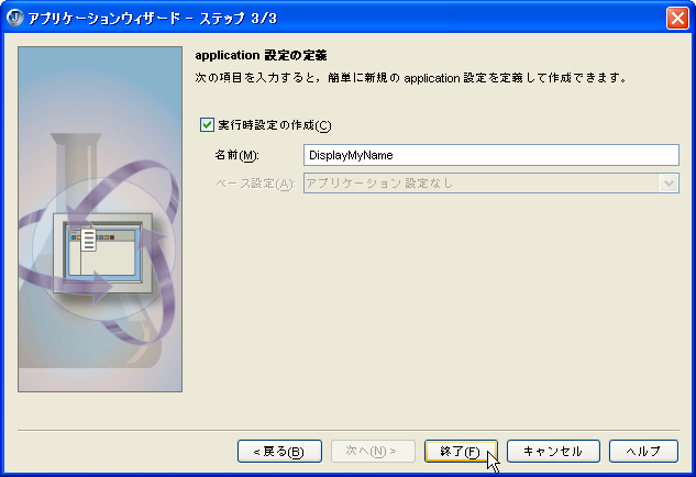 2 「アプリケーションウィザード」が起動します。最初のダイアログボックスでは、「クラス」として、「DisplayMyName」をキータイプします。その他の設定については、変更しないで「次へ」ボタンをクリックしてください。(ここで「終了」ボタンをクリックして、以下の手順を飛ばしてもかまいません。)