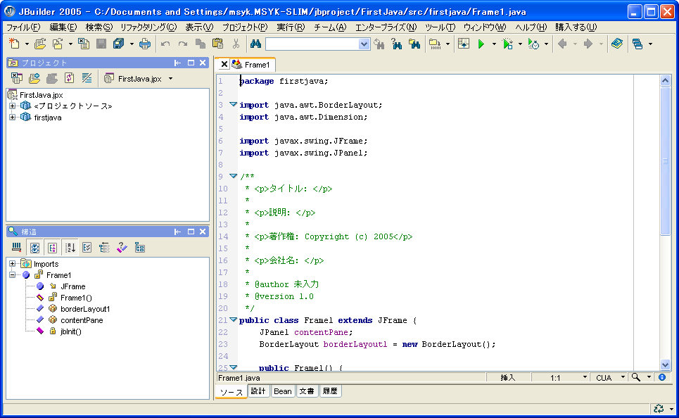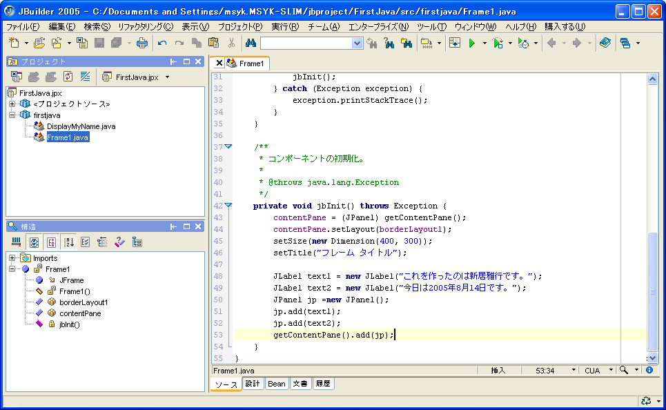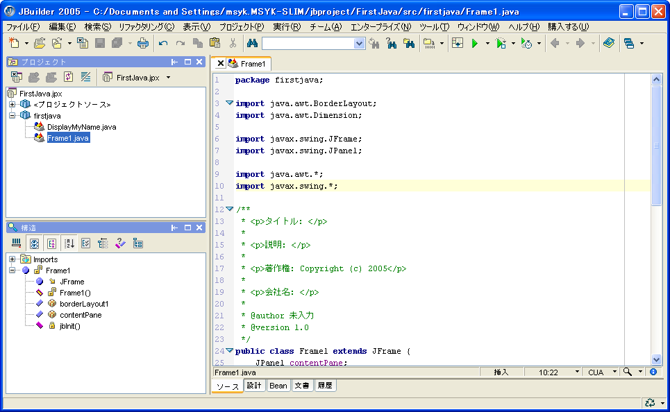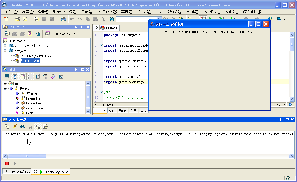 左側の「プロジェクト」ペインでは、firstjavaの下に項目が加わっていますが、ここで、2つのファイルがあります。ここでは、Frame1.javaだけを修正しました。なぜ2つのファイルがあるのかということなどは追々説明しますが、ウインドウを表示するのがFrame1、アプリケーション全体の管理をするのがここでのDisplayMyName.javaと考えておけばよいでしょう。
