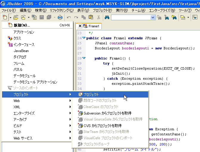 この章で作るプログラムは、前の章とは別のプロジェクトに入れておくことにしましょう。復習を兼ねてもう一度手順を追って説明をします。JBuilderを起動してから以下の手順を行なって下さい。