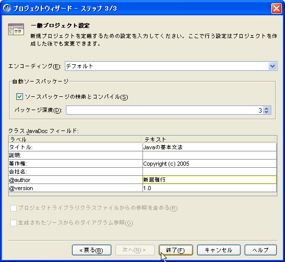 4ウィザードの3つ目のダイアログボックスでは、プロジェクトの情報を適当に入力しておきます。ここでは「タイトル」と「@auther」(作成者の意味)の右側のボックスにキータイプしました。そして、「終了」ボタンをクリックします。