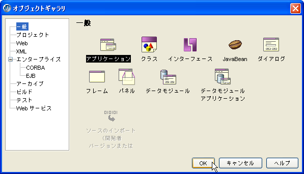 1ツールバーの「新規」ボタンをクリックします。 「オブジェクトギャラリ」で、左側のリストが「一般」が選択されていることを確認し、アイコンの中にある「アプリケーション」をクリックして選択し、OKボタンをクリックします。あるいは、「アプリケーション」をダブルクリックします。